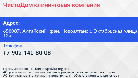 ЧистоДом, клининговая компания по адресу 658087, Алтайский край, Новоалтайск, Октябрьская улица, 12а в дальнейшем Организация, размещена в следующих категориях: