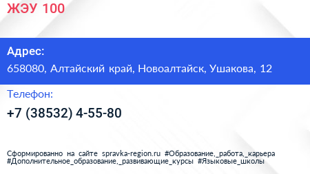 ЖЭУ-100 по адресу 658080, Алтайский край, Новоалтайск, Ушакова, 12 в дальнейшем Организация, размещена в следующих категориях: