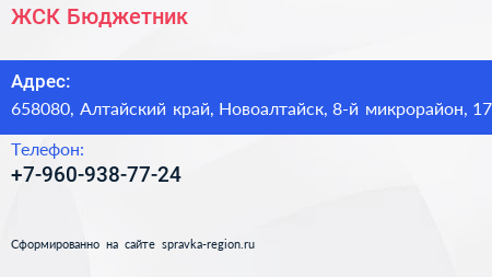 ЖСК Бюджетник по адресу 658080, Алтайский край, Новоалтайск, 8-й микрорайон, 17 в дальнейшем Организация, размещена в следующих категориях: