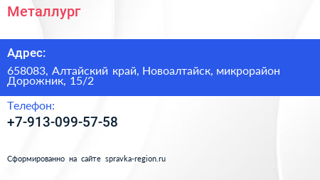 Металлург по адресу 658083, Алтайский край, Новоалтайск, микрорайон Дорожник, 15/2 в дальнейшем Организация, размещена в следующих категориях:
