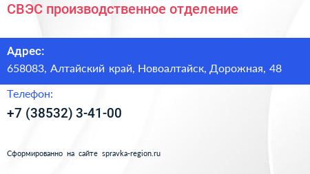 СВЭС, производственное отделение по адресу 658083, Алтайский край, Новоалтайск, Дорожная, 48 в дальнейшем Организация, размещена в следующих категориях: