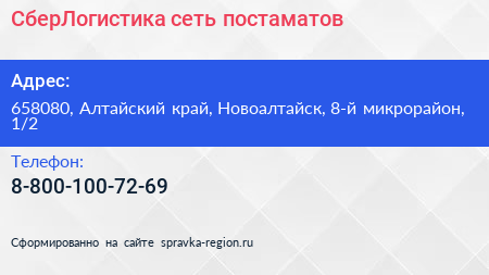 СберЛогистика, сеть постаматов по адресу 658080, Алтайский край, Новоалтайск, 8-й микрорайон, 1/2 в дальнейшем Организация, размещена в следующих категориях: