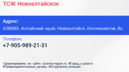 ТСЖ Новоалтайское по адресу 658080, Алтайский край, Новоалтайск, Космонавтов, 8а в дальнейшем Организация, размещена в следующих категориях: