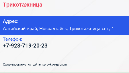 Трикотажница по адресу Алтайский край, Новоалтайск, Трикотажница снт, 1 в дальнейшем Организация, размещена в следующих категориях: