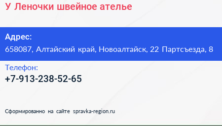 У Леночки, швейное ателье по адресу 658087, Алтайский край, Новоалтайск, 22 Партсъезда, 8 в дальнейшем Организация, размещена в следующих категориях: