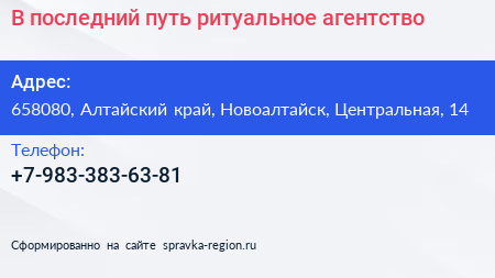 В последний путь, ритуальное агентство по адресу 658080, Алтайский край, Новоалтайск, Центральная, 14 в дальнейшем Организация, размещена в следующих категориях: