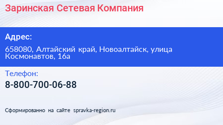 Заринская Сетевая Компания по адресу 658080, Алтайский край, Новоалтайск, улица Космонавтов, 16а в дальнейшем Организация, размещена в следующих категориях: