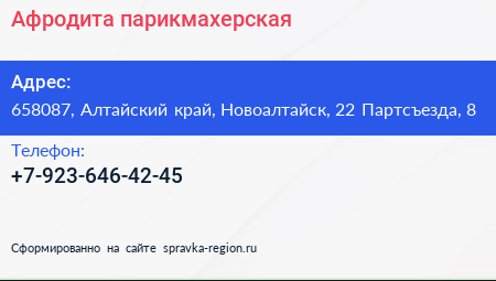 Афродита, парикмахерская по адресу 658087, Алтайский край, Новоалтайск, 22 Партсъезда, 8 в дальнейшем Организация, размещена в следующих категориях:
