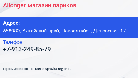 Allonger, магазин париков по адресу 658080, Алтайский край, Новоалтайск, Деповская, 17 в дальнейшем Организация, размещена в следующих категориях:
