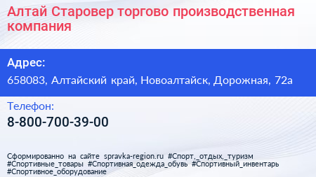 Алтай-Старовер, торгово-производственная компания по адресу 658083, Алтайский край, Новоалтайск, Дорожная, 72а в дальнейшем Организация, размещена в следующих категориях:
