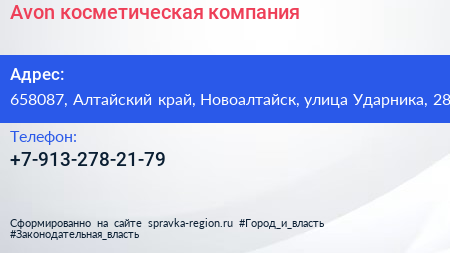 Avon, косметическая компания по адресу 658087, Алтайский край, Новоалтайск, улица Ударника, 28 в дальнейшем Организация, размещена в следующих категориях: