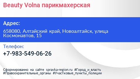 Beauty Volna, парикмахерская по адресу 658080, Алтайский край, Новоалтайск, улица Космонавтов, 15 в дальнейшем Организация, размещена в следующих категориях: