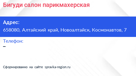 Бигуди, салон-парикмахерская по адресу 658080, Алтайский край, Новоалтайск, Космонавтов, 7 в дальнейшем Организация, размещена в следующих категориях: