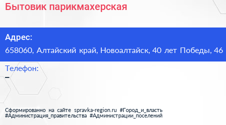 Бытовик, парикмахерская по адресу 658060, Алтайский край, Новоалтайск, 40 лет Победы, 46 в дальнейшем Организация, размещена в следующих категориях: