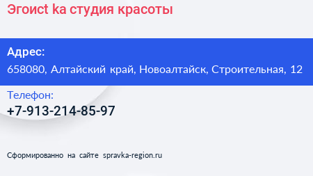 Эгоисt`ka, студия красоты по адресу 658080, Алтайский край, Новоалтайск, Строительная, 12 в дальнейшем Организация, размещена в следующих категориях: