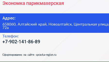 Экономка, парикмахерская по адресу 658060, Алтайский край, Новоалтайск, Центральная улица, 72а в дальнейшем Организация, размещена в следующих категориях: