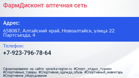 ФармДисконт, аптечная сеть по адресу 658087, Алтайский край, Новоалтайск, улица 22 Партсъезда, 4 в дальнейшем Организация, размещена в следующих категориях: