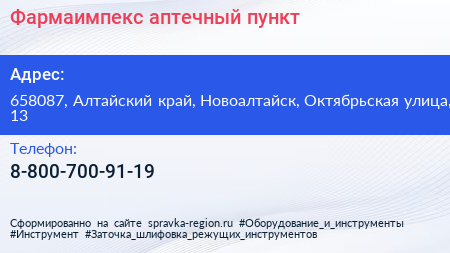 Фармаимпекс, аптечный пункт по адресу 658087, Алтайский край, Новоалтайск, Октябрьская улица, 13 в дальнейшем Организация, размещена в следующих категориях:
