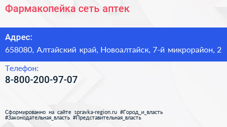 Фармакопейка, сеть аптек по адресу 658080, Алтайский край, Новоалтайск, 7-й микрорайон, 2 в дальнейшем Организация, размещена в следующих категориях: