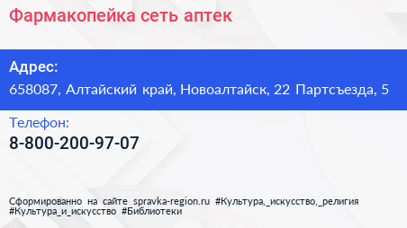 Фармакопейка, сеть аптек по адресу 658087, Алтайский край, Новоалтайск, 22 Партсъезда, 5 в дальнейшем Организация, размещена в следующих категориях: