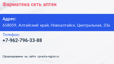 Фарматека, сеть аптек по адресу 658059, Алтайский край, Новоалтайск, Центральная, 33а в дальнейшем Организация, размещена в следующих категориях: