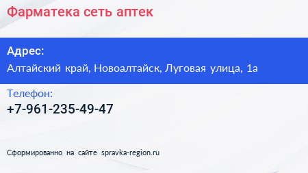 Фарматека, сеть аптек по адресу Алтайский край, Новоалтайск, Луговая улица, 1а в дальнейшем Организация, размещена в следующих категориях: