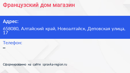 Французский дом, магазин по адресу 658080, Алтайский край, Новоалтайск, Деповская улица, 17 в дальнейшем Организация, размещена в следующих категориях: