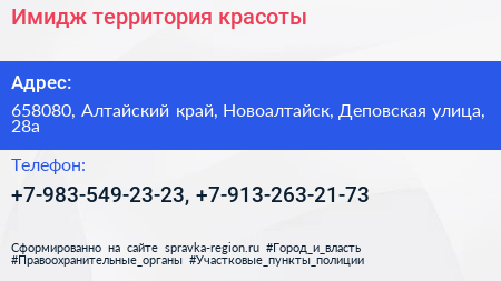 Имидж, территория красоты по адресу 658080, Алтайский край, Новоалтайск, Деповская улица, 28а в дальнейшем Организация, размещена в следующих категориях: