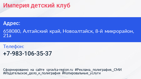 Империя, детский клуб по адресу 658080, Алтайский край, Новоалтайск, 8-й микрорайон, 21а в дальнейшем Организация, размещена в следующих категориях: