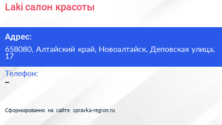 Laki, салон красоты по адресу 658080, Алтайский край, Новоалтайск, Деповская улица, 17 в дальнейшем Организация, размещена в следующих категориях: