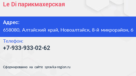 Le.Di, парикмахерская по адресу 658080, Алтайский край, Новоалтайск, 8-й микрорайон, 6 в дальнейшем Организация, размещена в следующих категориях: