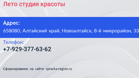 Лето, студия красоты по адресу 658080, Алтайский край, Новоалтайск, 8-й микрорайон, 33 в дальнейшем Организация, размещена в следующих категориях: