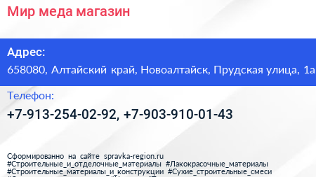 Мир меда, магазин по адресу 658080, Алтайский край, Новоалтайск, Прудская улица, 1а в дальнейшем Организация, размещена в следующих категориях: