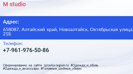 M`studio по адресу 658087, Алтайский край, Новоалтайск, Октябрьская улица, 21Б в дальнейшем Организация, размещена в следующих категориях: