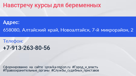 Навстречу, курсы для беременных по адресу 658080, Алтайский край, Новоалтайск, 7-й микрорайон, 2 в дальнейшем Организация, размещена в следующих категориях: