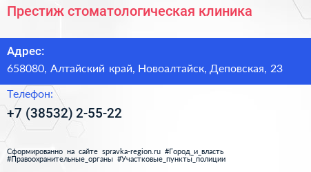 Престиж, стоматологическая клиника по адресу 658080, Алтайский край, Новоалтайск, Деповская, 23 в дальнейшем Организация, размещена в следующих категориях: