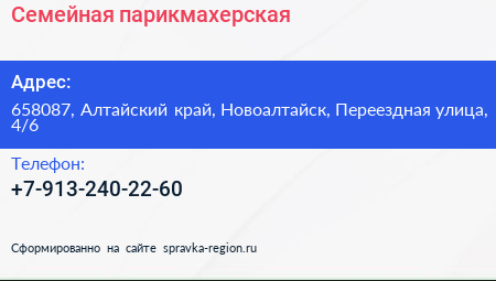Семейная, парикмахерская по адресу 658087, Алтайский край, Новоалтайск, Переездная улица, 4/6 в дальнейшем Организация, размещена в следующих категориях: