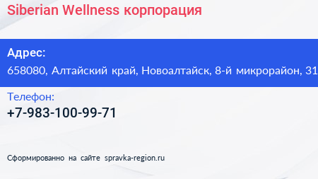Siberian Wellness, корпорация по адресу 658080, Алтайский край, Новоалтайск, 8-й микрорайон, 31 в дальнейшем Организация, размещена в следующих категориях: