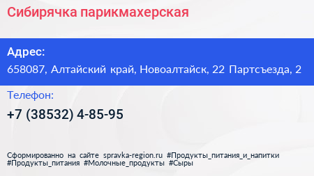 Сибирячка, парикмахерская по адресу 658087, Алтайский край, Новоалтайск, 22 Партсъезда, 2 в дальнейшем Организация, размещена в следующих категориях: