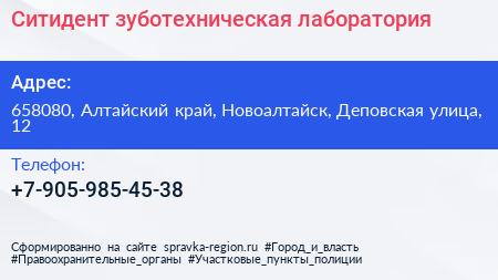 Ситидент, зуботехническая лаборатория по адресу 658080, Алтайский край, Новоалтайск, Деповская улица, 12 в дальнейшем Организация, размещена в следующих категориях: