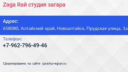 Zaga Raй, студия загара по адресу 658080, Алтайский край, Новоалтайск, Прудская улица, 1а в дальнейшем Организация, размещена в следующих категориях: