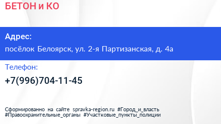 БЕТОН и КО по адресу посёлок Белоярск, ул. 2-я Партизанская, д. 4а в дальнейшем Организация, размещена в следующих категориях: