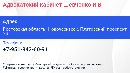Адвокатский кабинет Шевченко И.В. по адресу Ростовская область, Новочеркасск, Платовский проспект, 98 в дальнейшем Организация, размещена в следующих категориях: