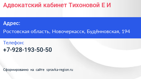 Адвокатский кабинет Тихоновой Е.И. по адресу Ростовская область, Новочеркасск, Будённовская, 194 в дальнейшем Организация, размещена в следующих категориях: