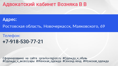 Адвокатский кабинет Возняка В.В. по адресу Ростовская область, Новочеркасск, Маяковского, 69 в дальнейшем Организация, размещена в следующих категориях: