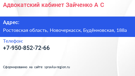 Адвокатский кабинет Зайченко А.С. по адресу Ростовская область, Новочеркасск, Будённовская, 188а в дальнейшем Организация, размещена в следующих категориях: