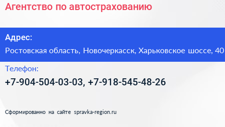 Агентство по автострахованию по адресу Ростовская область, Новочеркасск, Харьковское шоссе, 40 в дальнейшем Организация, размещена в следующих категориях: