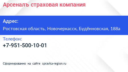 Арсеналъ, страховая компания по адресу Ростовская область, Новочеркасск, Будённовская, 188а в дальнейшем Организация, размещена в следующих категориях: