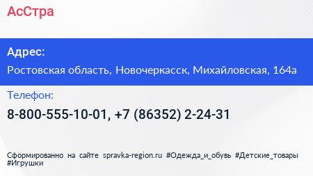 АсСтра по адресу Ростовская область, Новочеркасск, Михайловская, 164а в дальнейшем Организация, размещена в следующих категориях: