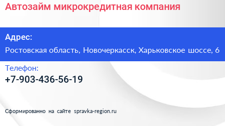 Автозайм, микрокредитная компания по адресу Ростовская область, Новочеркасск, Харьковское шоссе, 6 в дальнейшем Организация, размещена в следующих категориях: